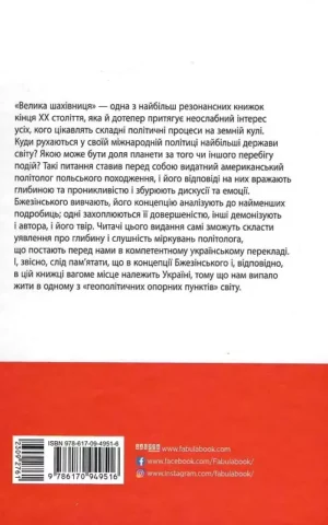 «Велика шахівниця» — одна з найбільш резонансних книжок кінця ХХ ст., яка й дотепер притягує інтерес читацької аудиторії. Куди рухаються у своїй міжнародній політиці найбільші держави світу? Якою може бути доля планети за того чи іншого перебігу подій?