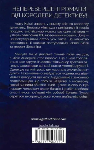 250₴Оригінальна ціна: 250₴.245₴Поточна ціна: 245₴.Минуло лише декілька тижнів після весілля, а місіс Андерхей стає вдовою. І це з нею трапляється вже вдруге. Її чоловік-мільйонер трагічно загинув, залишивши всі свої статки молодій дружині. Однак де великі гроші, там удосталь охочих їх розділити. І вже напевно знайдеться людина, яка візьметься доводити, що місіс Андерхей не є законною спадкоємицею. До того ж невдовзі в місцевому готелі виявили вбитого, який, цілком імовірно, був першим чоловіком вдови багатія. Це збіг чи обидві смерті якось пов’язані між собою? Еркюль Пуаро береться за справу, а отже, точно знайде відповідь!