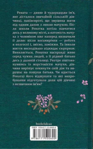 Рената – дивне й чудернацьке ім’я, яке дісталося звичайній сільській дівчинці, напівсироті, що змушена жити під одним дахом з лихою мачухою. Після школи Ренатка хотіла навчатися десь у великому місті, а натомість мачуха з чоловіком вже наперед визначили її долю: після восьмирічки – робота в колгоспі і, звісно, заміжжя.