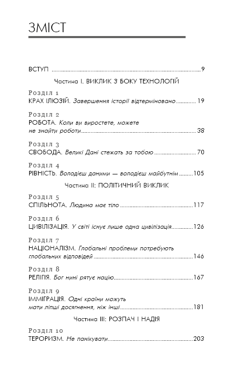 Минуле людства у книзі Sapiens «Людина розумна». Далеке майбутнє у книзі Homo Deus «Людина божественна». Саме настав час замислитися над питаннями сьогодення. Що означає підйом Дональда Трампа? Що можна зробити з епідемією фейкових новин? Чому ліберальна демократія зазнає кризи? Чи повернеться Бог? Чи наближається нова Світова війна? Яка цивілізація домінує в світі — Захід, Китай, іслам? Чи варто Європі тримати відкритими двері для іммігрантів? Чи може націоналізм вирішити проблеми нерівності й зміни клімату? Що треба вчинити з тероризмом? У третій книзі Ювала Ноя Харарі простих відповідей не буде. Проте захоплива подорож навколо глибокого смислу подій, що відбуваються сьогодні — гарантована.