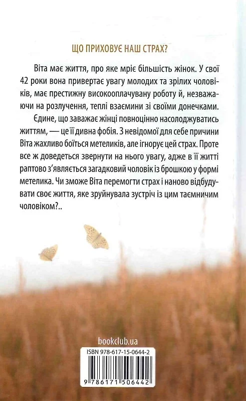 Єдине, що заважає жінці повноцінно насолоджуватись життям, – це її дивна фобія. З невідомої для себе причини Віта жахливо боїться метеликів, але ігнорує цей страх. Проте все ж доведеться звернути на нього увагу, адже в її житті раптово з’являється загадковий чоловік із брошкою у формі метелика.