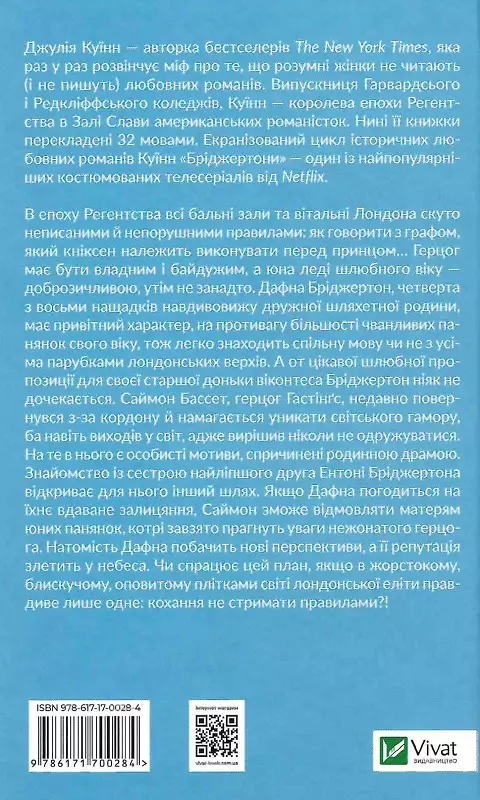 В епоху Регентства всі бальні зали та вітальні Лондона скуто неписаними й непорушними правилами: як говорити з графом, який кніксен належить виконувати перед принцом… Герцог має бути владним і байдужим, а юна леді шлюбного віку — доброзичливою, утім не занадто. Дафна Бріджертон, четверта з восьми нащадків навдивовижу дружної шляхетної родини, має привітний характер, на противагу більшості чванливих панянок свого віку, тож легко знаходить спільну мову чи не з усіма парубками лондонських верхів. А от цікавої шлюбної пропозиції для своєї старшої доньки віконтеса Бріджертон ніяк не дочекається. Саймон Бассет, герцог Гастінґс, недавно повернувся з-за кордону й намагається уникати світського гамору, ба навіть виходів у світ, адже вирішив ніколи не одружуватися. На те в нього є особисті мотиви, спричинені родинною драмою. Знайомство із сестрою найліпшого друга Ентоні Бріджертона відкриває для нього інший шлях. Якщо Дафна погодиться на їхнє вдаване залицяння, Саймон зможе відмовляти матерям юних панянок, котрі завзято прагнуть уваги нежонатого герцога. Натомість Дафна побачить нові перспективи, а її репутація злетить у небеса. Чи спрацює цей план, якщо в жорстокому, блискучому, оповитому плітками світі лондонської еліти правдиве лише одне: кохання не стримати правилами.
