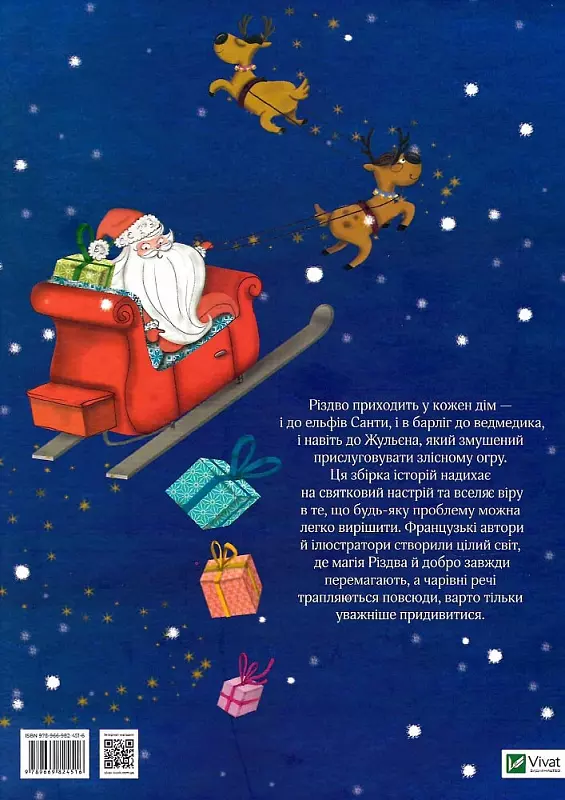 Різдво приходить у кожен дім — і до ельфів Санти, і в барліг до ведмедика, і навіть до Жульєна, який змушений прислуговувати злісному огру. Ця збірка історій надихає на святковий настрій та вселяє віру в те, що будь-яку проблему можна легко вирішити. Французькі автори й ілюстратори створили цілий світ, де магія Різдва й добро завжди перемагають, а чарівні речі трапляються повсюди, варто тільки уважніше придивитися.