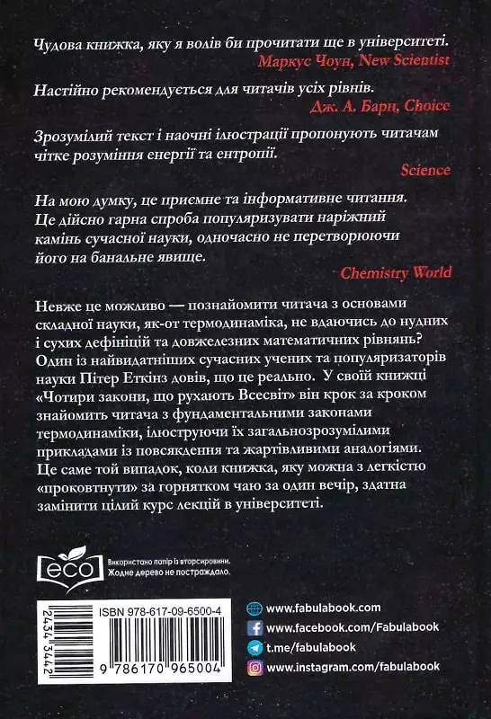 Закони термодинаміки надають руху всьому, що відбувається у Всесвіті. Від раптового розширення хмари газу до охолодження гарячого металу, від розгортання листка до перебігу самого життя — усе рухається або гальмується цими законами. Ця коротка, але дотепна книжка знайомить читачів з одним із наріжних каменів сучасної науки — чотирма законами термодинаміки, що встановлюють фундаментальні поняття, як-от температура й тепло, виявляють стрілу часу й навіть саму природу енергії. Автор, Пітер Еткінз, один з найбільших авторитетів у галузі термодинаміки, простою мовою й майже не застосовуючи математики, пояснює суть цих законів і те, як вони функціонують.