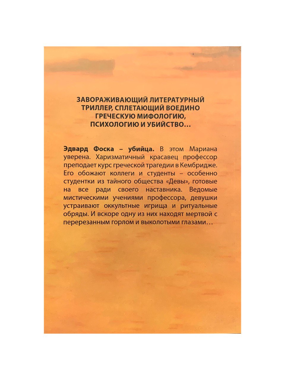 Эдвард Фоска – убийца. В этом Мариана уверена. Харизматичный красавец профессор преподает курс греческой трагедии в Кембридже. Его обожают коллеги и студенты – особенно студентки из тайного общества “Девы”, готовые на все ради своего наставника. Ведомые мистическими учениями профессора, девушки устраивают оккультные игрища и ритуальные обряды. И вскоре, одну из них находят мертвой с перерезанным горлом и выколотыми глазами…