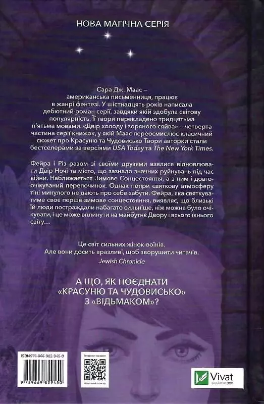 Сара Дж. Маас – американська письменниця, працює в жанрі фентезі. У шістнадцять років написала дебютний роман серії, завдяки якій здобула світову популярність. Її твори перекладено тридцятьма п’ятьма мовами. «Двір холоду і зоряного сяйва» – четверта частина серії книжок, у якій Маас переосмислює класичний сюжет про Красуню та Чудовисько. Твори авторки стали бестселерами за версіями USA Today та The New York Times.