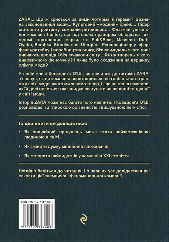 ZARA… Що ж криється за цими чотирма літерами? Визнана законодавиця моди… Культовий «модний» бренд… Лідер світового рейтингу компаній-ритейлерів… Флагман унікальної компанії Inditex, що під своїм прапором об’єднала такі відомі торговельні марки, як Pull&Bear, Massimo Dutti, Oysho, Bershka, Stradivarius, Uterqüe… Революціонер у сфері фешн-ритейлу і виробництва одягу, бізнес-модель якого нині вивчають провідні бізнес-школи світу… Хто ж творець такого дивовижного феномену? І яким було сходження на вершину олімпу моди? У своїй книзі Ковадонґа О’Ші, сягаючи аж до витоків ZARA, з’ясовує, як ця компанія перетворилася на глобального гравця у світі моди, якого ми знаємо тепер, і, що не менш важливо, як їй досі вдається так швидко реагувати на основні тенденції у світі моди.