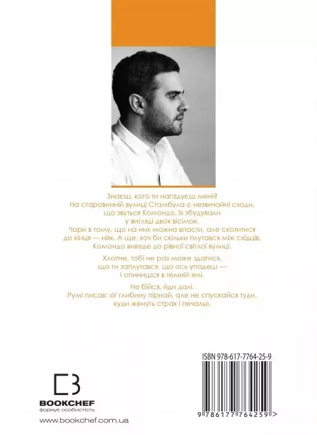 Знаєш, кого ти нагадуєш мені? На старовинній вулиці Стамбула є незвичайні сходи, що звуться Комондо, їх збудували у вигляді двох вісімок. Чари в тому, що на них можна впасти, але скотитися до кінця — ніяк. А ще, хоч би скільки плутався між східців, Комондо виведе до рівної світлої вулиці. Хлопче, тобі не раз може здатися, що ти заплутався, що ось упадеш — і опинишся в темній ямі. Не бійся, йди далі. Румі писав: “У глибину пірнай, але не спускайся туди, куди женуть страх і печаль”.