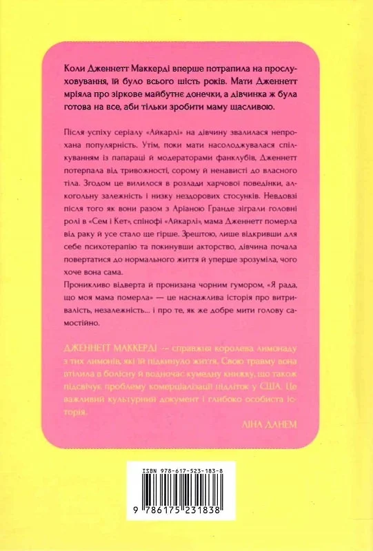 У мемуарах «Я рада, що моя мама померла» американська акторка Дженнетт Маккерді, відома багатьом глядачам серіалу «iCarly» як Сем розкриває шокуючу та чесну історію свого життя, що змінить ваше сприйняття дитячої слави та її наслідків.