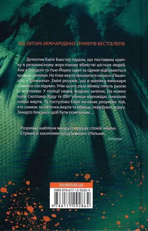Детектив Емілі Бакстер гадала, що поставила крапку у резонансному жорстокому вбивстві шістьох людей. Але в Лондоні та Нью-Йорку один за одним відбуваються криваві злочини. На тілах жертв лишаються написи «Пішак» або «Приманка». Емілі розуміє, що у маніяка-лялькаря з’явився наслідувач. Але цього разу вбивці гинуть разом із жертвами. У поліції не лишається жодних зачіпок. На кожен крок Скотланд-Ярду та ФБР убивця відповідає шквалом нових жертв. Та поступово Емілі починає розуміти: той, хто смикає за ниточки жертв та вбивць, перебуває поруч. Занадто близько, щоб бути поміченим…