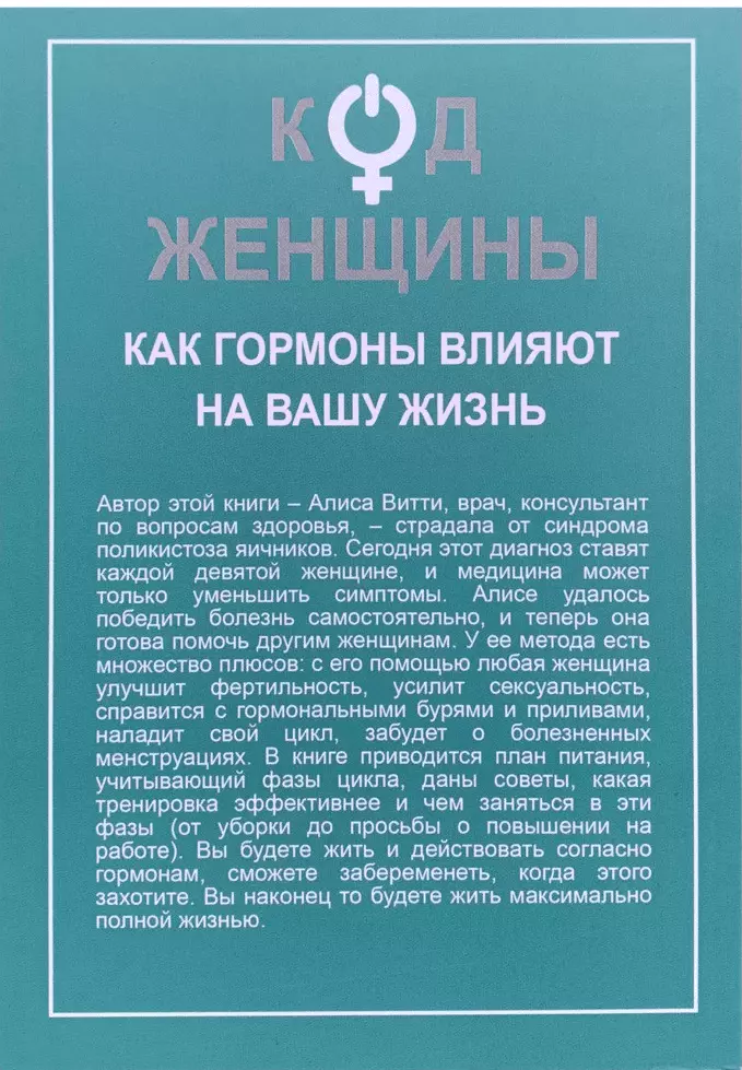 В книге приводится план питания, учитывающий фазы цикла, даны советы, какая тренировка эффективнее и чем заняться в эти фазы (от уборки до просьбы о повышении на работе). Вы будете жить и действовать согласно гормонам, сможете забеременеть, когда этого захотите.