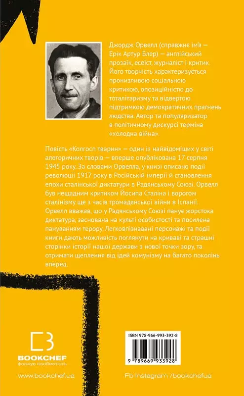 Повість «Колгосп тварин» — один із найвідоміших у світі алегоричних творів — вперше опублікована 17 серпня 1945 року. За словами Орвелла, у книзі описано події революції 1917 року в Російській імперії й становлення епохи сталінської диктатури в Радянському Союзі. Орвелл був нещадним критиком Й. Сталіна і ворогом сталінізму ще з часів громадянської війни в Іспанії. Орвелл вважав, що у Радянському Союзі панує жорстока диктатура, заснована на культі особистості та посилена пануванням терору. Легковпізнавані персонажі та події книги дають можливість поглянути на криваві та страшні сторінки історії нашої держави з нової точки зору, та отримати щеплення від ідей комунізму на багато поколінь вперед.