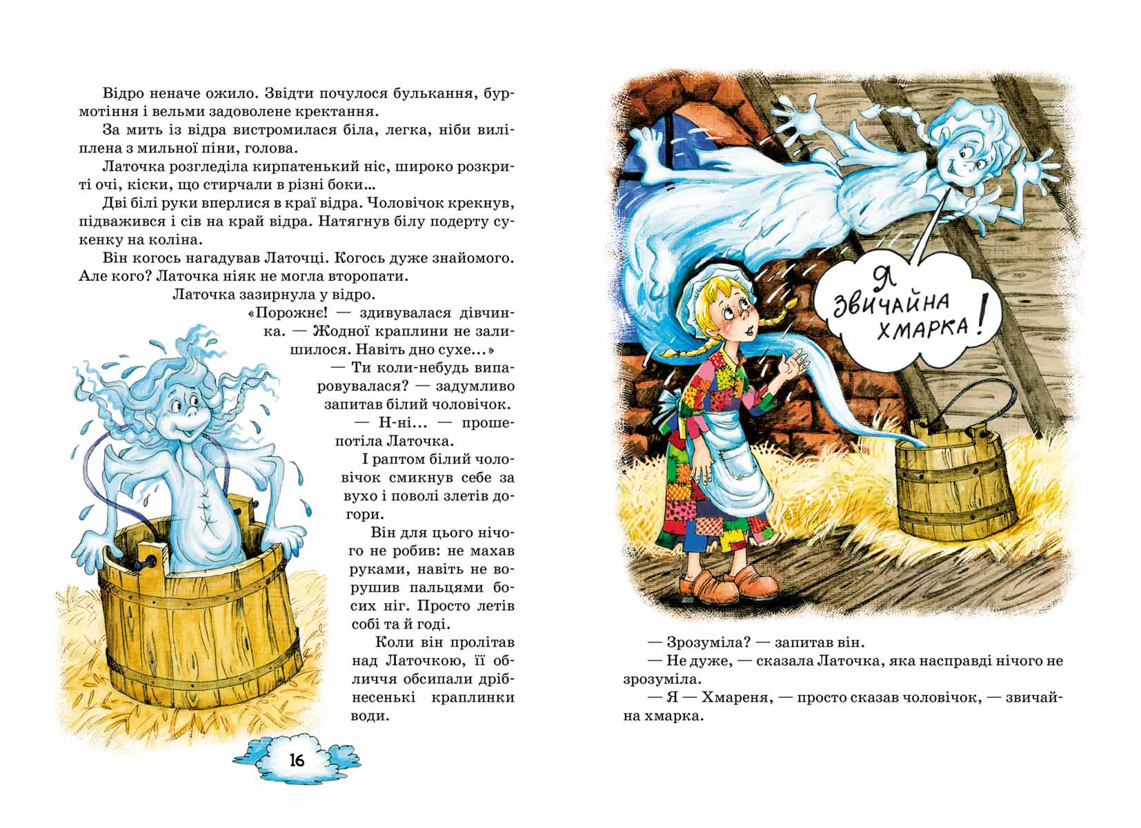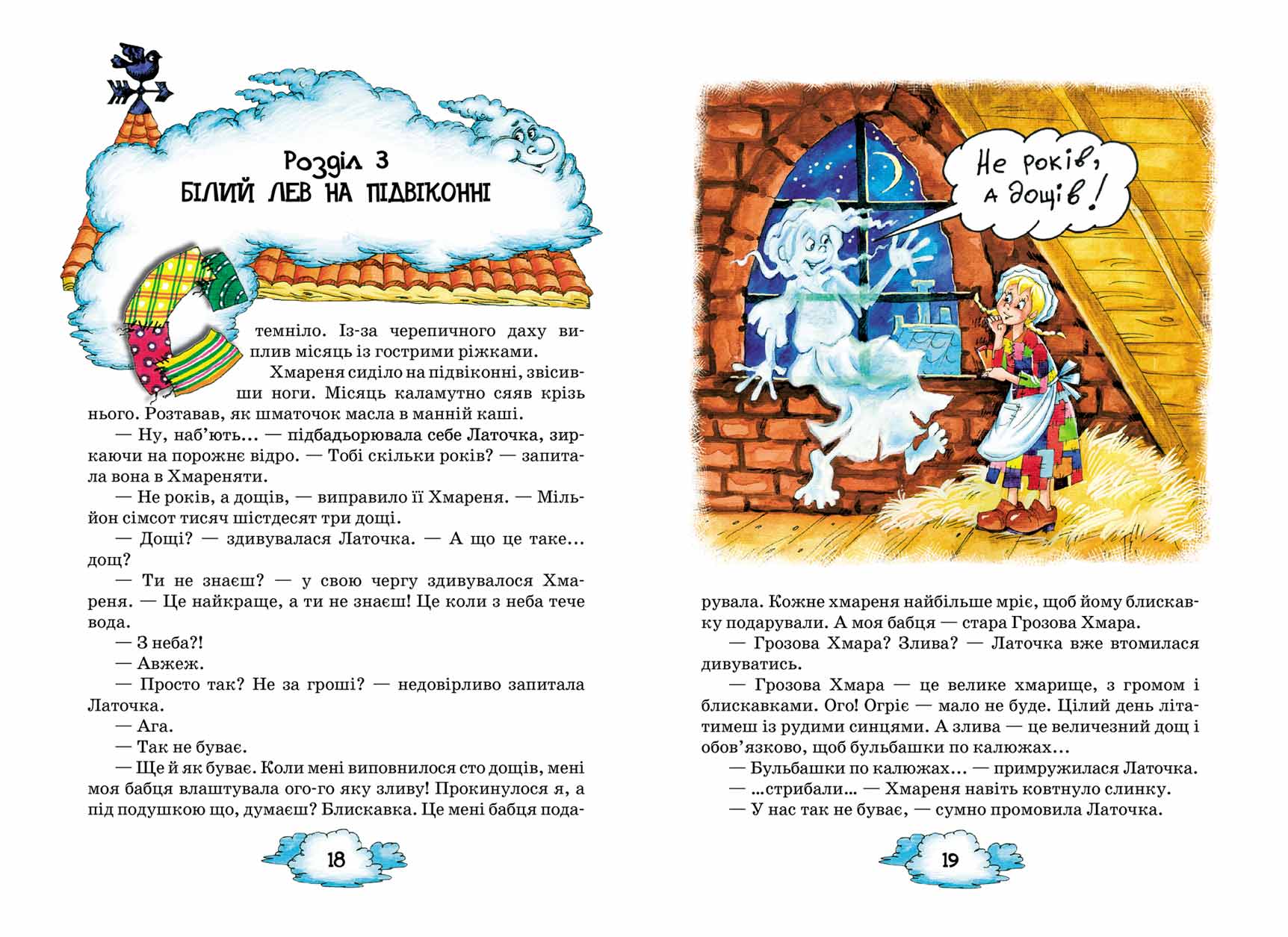 Ця книжка розповідає про одне королівство, у якому існувала жахлива заборона на вільне користування водою. Тож вода стала на вагу золота. Та ось у запилюжене, втомлене посухою королівство навідалася справжня хмарка, а точніше Хмареня, яке збурило геть усе. Воно подружилося з бідною дівчинкою-служницею на ім’я Латочка, і вже разом вони, потрапляючи в неймовірні пригоди, нарешті перемагають жадібного короля Фонтаніуса та його підступного прислужника Слуха.