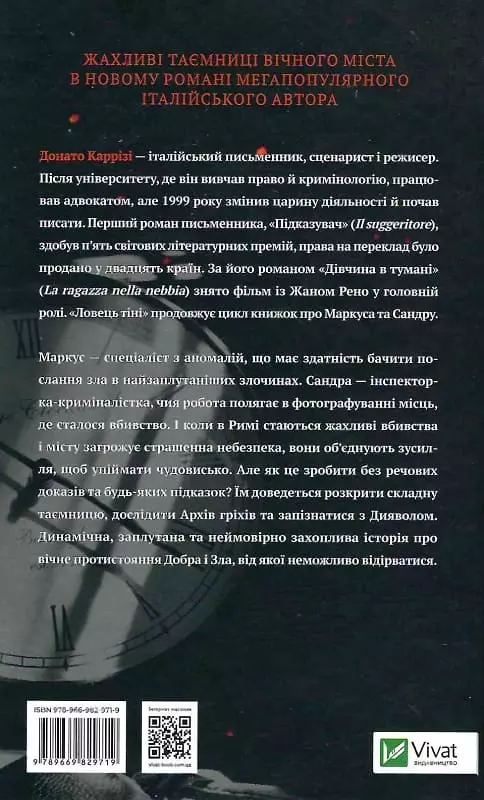 Донато Каррізі — італійський письменник, сценарист і режисер. Після університету, де він вивчав право й кримінологію, працював адвокатом, але 1999 року змінив царину діяльності й почав писати. Перший роман письменника, «Підказувач» (Il suggeritore), здобув п’ять світових літературних премій, права на переклад було продано у двадцять країн. За його романом «Дівчина в тумані» (La ragazza nella nebbia) знято фільм із Жаном Рено у головній ролі. «Ловець тіні» продовжує цикл книжок про Маркуса та Сандру.