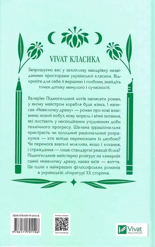 Валер’ян Підмогильний хотів написати роман, у якому майстром корабля буде жінка. І написав «Невеличку драму» — роман про нові взаємини, новий побут, нову мораль і вічні питання, які постають у несподіваних учудненнях доби технічного прогресу. Шалена ірраціональна пристрасть чи холодний раціональний розрахунок — хто вийде переможцем із двобою? Чи перемога взагалі можлива, якщо і кохання, і страждання — лише стандартні реакції білка? Підмогильний майстерно розігрує на камерній сцені невеличку драму, назва якій — життя. Це один з найкращих філософських романів в українській літературі ХХ сторіччя.