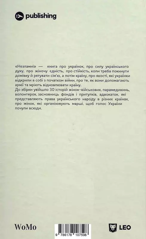 «Незламні» — книга про українок, про силу українського духу, про жіночу єдність, про стійкість, коли треба покинути домівку і рятувати сім’ю, а потім країну, про якості, які українки відкрили в собі з початком війни, про те, як вони допомагають армії та мріють відновлювлювати країну.
