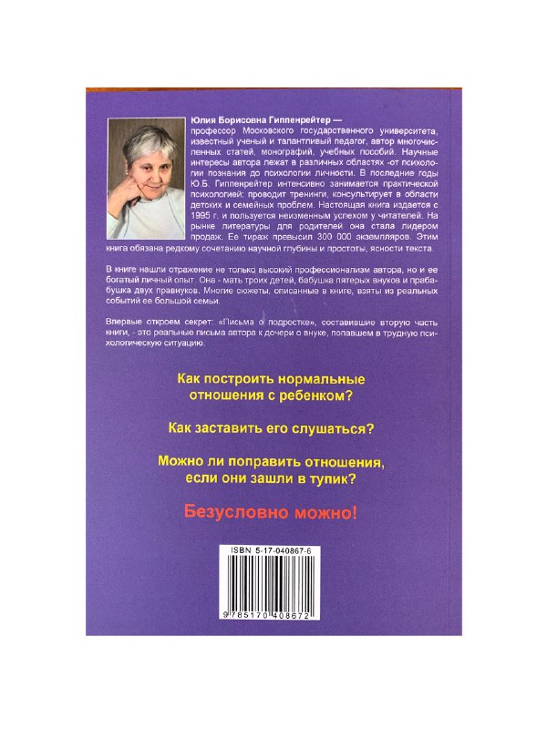 Малыш, который получает полноценное питание и хороший медицинский уход, но лишен полноценного общения со взрослым, плохо развивается не только психически, но и физически: он не растет, худеет, теряет интерес к жизни. “Проблемные”, “трудные”, “непослушные” и “невозможные” дети, так же как дети “с комплексами”, “забитые” или “несчастные” – всегда результат неправильно сложившихся отношений в семье. Книга Юлии Борисовны Гиппенрейтер нацелена на гармонизацию взаимоотношений в семье, ведь стиль общения родителей сказывается на будущем их ребенка!