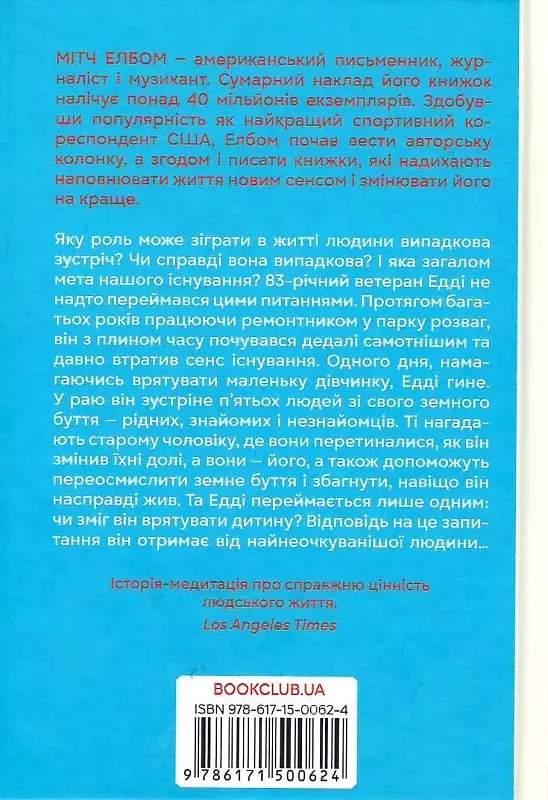 Мітч Елбом — американський письменник, журналіст і музикант. Сумарний наклад його книжок налічує понад 40 мільйонів екземплярів. Здобувши популярність як найкращий спортивний кореспондент США, Елбом почав вести авторську колонку, а згодом і писати книжки, які надихають наповнювати життя новим сенсом і змінювати його на краще.