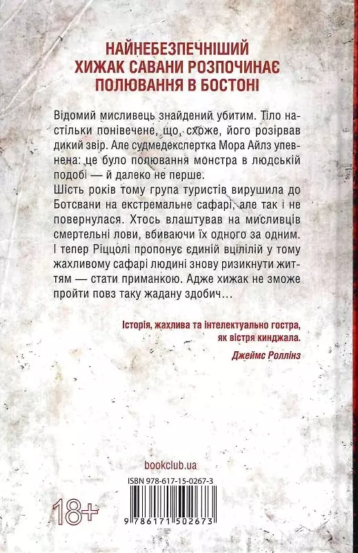Шість років тому група туристів вирушила до Ботсвани на екстремальне сафарі, але так і не повернулася. Хтось влаштував на мисливців смертельні лови, вбиваючи їх одного за одним. І тепер Ріццолі пропонує єдиній вцілілій у тому жахливому сафарі людині знову ризикнути життям — стати приманкою. Адже хижак не зможе пройти повз таку жадану здобич…