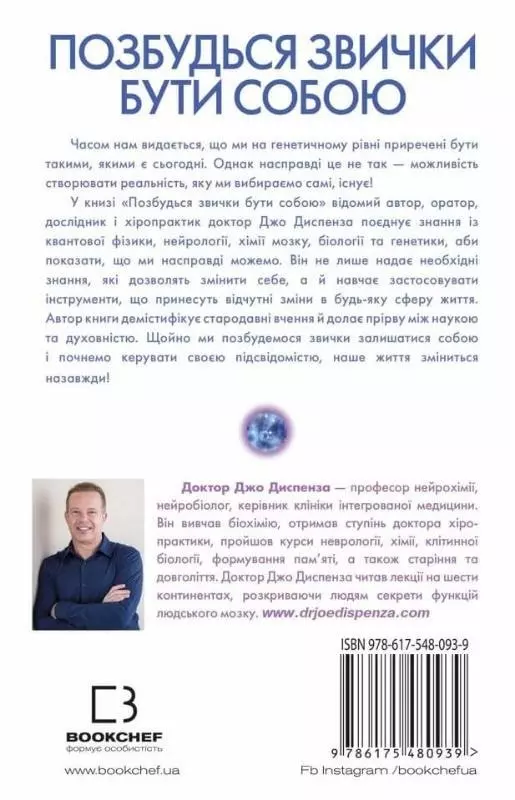 Мабуть, кожна людина в якийсь момент із жахом усвідомлює, що втратила здатність радіти. Відчувати радість щодня, щохвилини, щосекунди, тобто плекати в собі це почуття, незалежно від зовнішніх обставин. І тепер, щоб почуватися щасливою, доводиться заповнювати пустку всередині придбанням нової автівки, нових меблів, нового будинку тощо. Але ж це не має тривалого ефекту. До того ж, зізнаймося собі, ми витрачаємо безліч сил на те, щоб вдавати із себе людину, яку, на нашу думку, сприйме суспільство. Як змінити своє життя, як зробити так, щоб не залежати від середовища, а бути по-справжньому успішним, щасливим і жити у злагоді зі своїм Я? Відповіді на ці запитання ви знайдете у книзі, яку тримаєте в руках. Її автор Джо Диспенза — знаний дослідник, спеціаліст із хіропрактики — розповість про особливості людського мозку і підсвідомості й навчить, як перепрограмувати свідомість і досягти докорінних змін у житті.