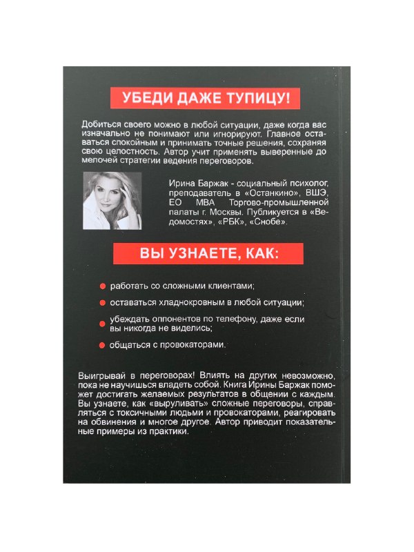 Выигрывай в переговорах! Влиять на других невозможно пока не научишься владеть собой. Книга Ирины Баржак поможет достигать желаемых результатов в общении с каждым. Вы узнаете, как “выруливать” сложные переговоры, справляться с токсичными людьми и провокаторами, реагировать на обвинения и многое другое. Автор приводит показательные примеры из практики.