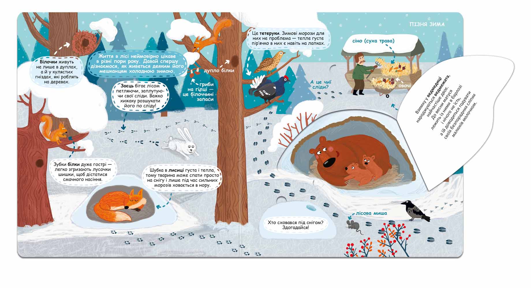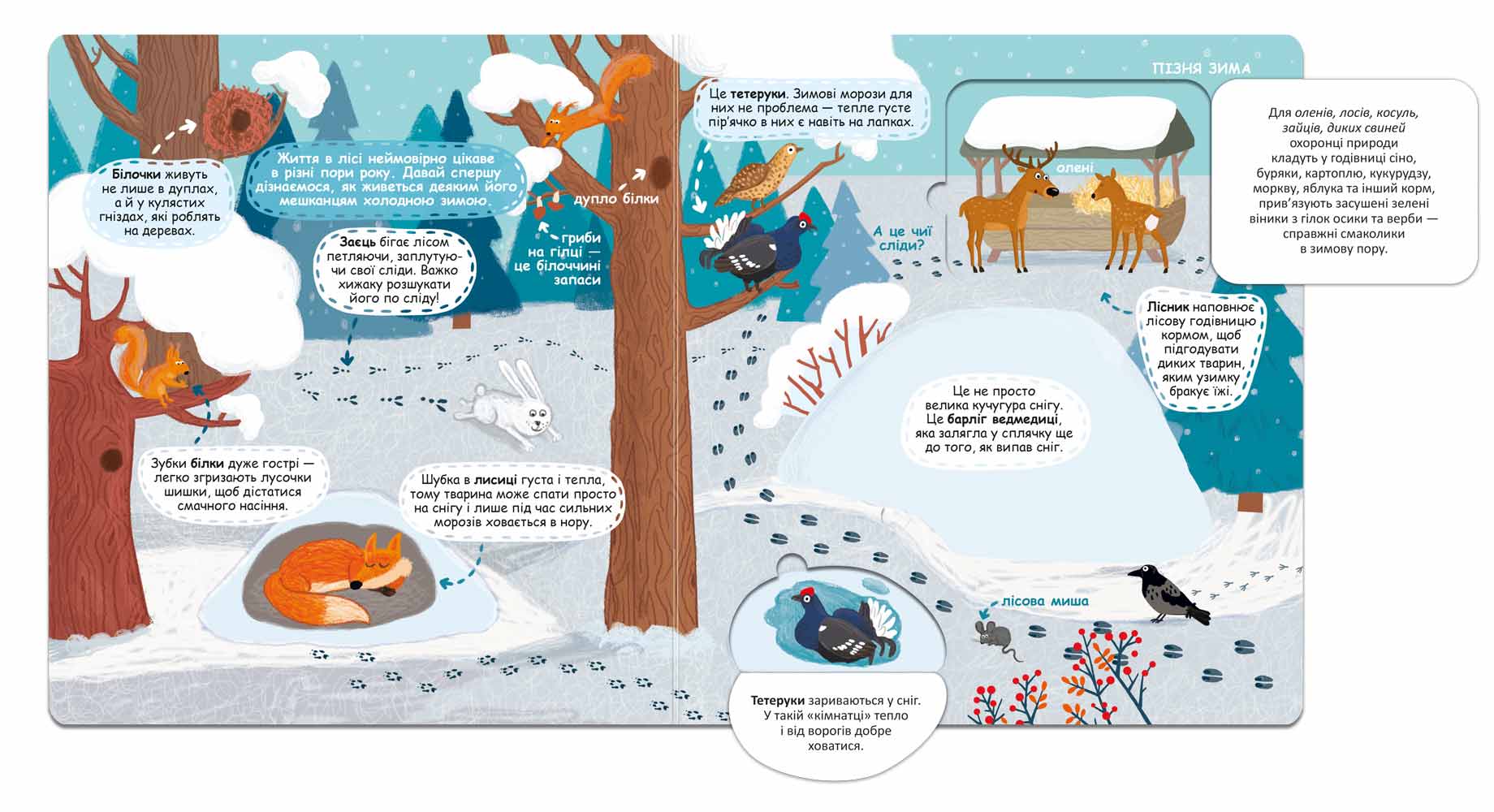 Ця книжка є справжньою енциклопедією життя лісових тварин і рослин. Розглядаючи чудові малюнки та відкриваючи «віконця», пізнавайте красу та таємниці лісу! Дізнавайтеся, як живуть лісові мешканці, чим харчуються, як готуються до зими, які тварини сплять удень, а які — вночі, хто з них робить найкращі запаси… Книга навчить помічати сезонні зміни в природі, дбайливо ставитися до тварин і рослин та любити все живе. Для читання дорослими дітям.