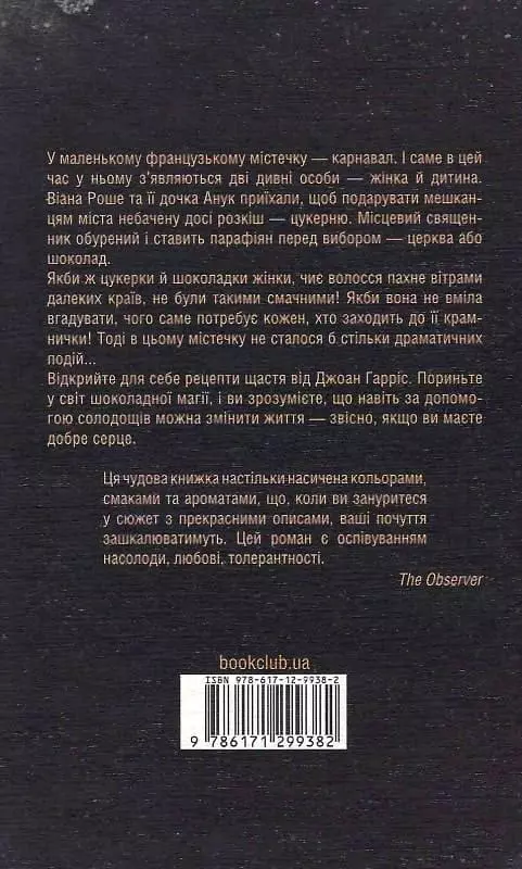Відкрийте для себе рецепти щастя від Джоан Гарріс. Пориньте у світ шоколадної магії, і ви зрозумієте, що навіть за допомогою солодощів можна змінити життя — звісно, якщо ви маєте добре серце та гарні наміри.