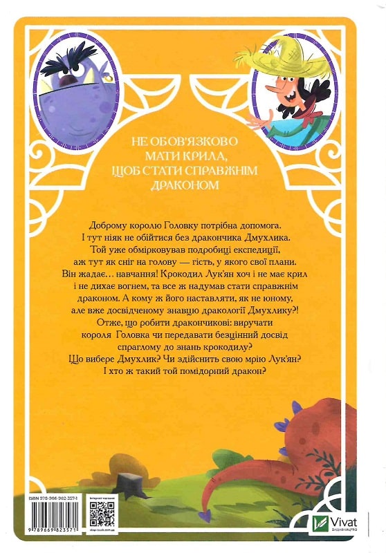 Доброму королю Головку потрібна допомога. І тут ніяк не обійтися без дракончика Дмухлика. Той уже обмірковував подробиці експедиції, аж тут як сніг на голову — гість, у якого свої плани. Він жадає… навчання! Крокодил Лук’ян хоч і не має крил і не дихає вогнем, та все ж надумав стати справжнім драконом. А кому ж його наставляти, як не юному, але вже досвідченому знавцю дракології Дмухлику?!