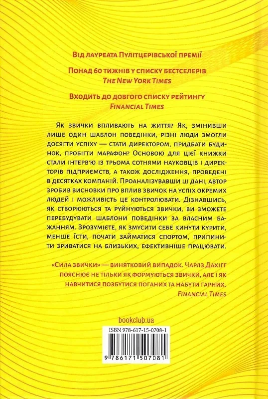 Як звички впливають на життя? Як, змінивши лише один шаблон поведінки, різні люди змогли досягти успіху: стати директором, придбати будинок, пробігти марафон? В основу цієї книжки лягли інтерв’ю із трьома сотнями науковців і директорів підприємств, дослідження, проведені в десятках компаній. Проаналізувавши все це, автор зрозумів, як кожна людина може контролювати свої звички, щоб досягти успіху. Дізнавшись, як створюються та руйнуються звички, ви зможете перебудувати шаблони поведінки, як собі забажаєте. Ви зрозумієте, як змусити себе не палити, менше їсти, займатися спортом, не кричати на близьких, ефективніше працювати.