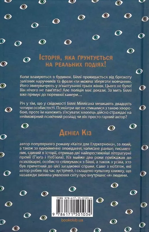 Цього ранку він прокинувся від того, що лягаві вдерлися в будинок і звинуватили у зґвалтуванні трьох жінок. Але він упевнений, що не робив цього! Принаймні не пам’ятає. Але чому? Можливо, якась із двадцяти трьох особистостей, що мешкали у його свідомості, замовчувала цей факт? Психіатри ще не стикалися з такою хворобою. Чи скоїв Мілліган усі ці злочини, чи він талановитий актор, який пошив усю Америку в дурні? Таємнича історія заснована на реальних подіях. Деніел Кіз особисто спілкувався з Біллі, а також з усіма, хто був причетний до цієї справи.