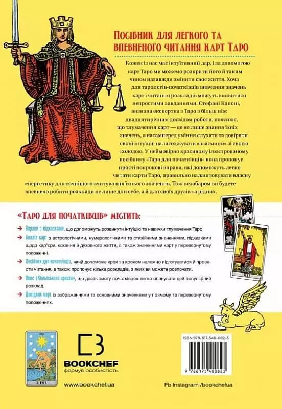 Кожен із нас має інтуїтивний дар, і за допомогою карт Таро ми можемо розкрити його й таким чином назавжди змінити своє життя. Хоча для тарологів-початківців вивчення значень карт і читання розкладів можуть виявитися непростими завданнями. Стефані Капоні, визнана експертка з Таро з більш ніж двадцятирічним досвідом роботи, пояснює, що тлумачення карт — це не лише знання їхніх значень, а насамперед уміння слухати та довіряти своїй інтуїції, налагоджувати «взаємини» зі своєю колодою. У неймовірно красивому ілюстрованому посібнику «Таро для початківців» вона пропонує прості покрокові вправи, які допоможуть легко читати карти Таро, правильно налаштовувати власну енергетику для точнішого зчитування їхнього значення. Тож незабаром ви будете впевнено робити розклади не лише для себе, а й для своїх друзів та рідних.
