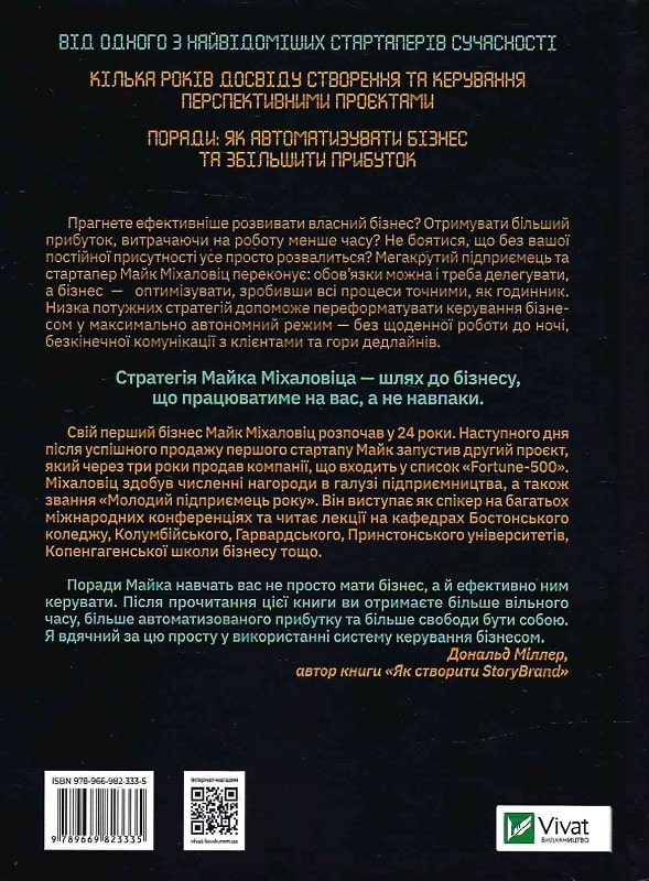 Прагнете ефективніше розвивати власний бізнес? Отримувати більший прибуток, витрачаючи на роботу менше часу? Не боятися, що без вашої постійної присутності усе просто розвалиться? Мегакрутий підприємець та стартапер Майк Міхаловіц переконує: обов’язки можна і треба делегувати, а бізнес — оптимізувати, зробивши всі процеси точними, як годинник. Низка потужних стратегій допоможе переформатувати керування бізнесом у максимально автономний режим — без щоденної роботи до ночі, безкінечної комунікації з клієнтами та гори дедлайнів.