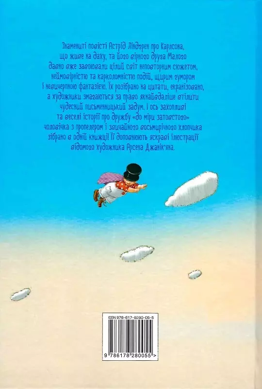 Знамениті повісті Астрід Ліндґрен про Карлсона, що живе на даху, та його вірного друга Малого давно вже завоювали цілий світ неповторним сюжетом, неймовірністю та карколомністю подій, щирим гумором і невичерпною фантазією. Їх давно вже розібрано на цитати, екранізовано, а художники змагаються за право якнайвдаліше втілити чудесний письменницький задум. І ось захопливі та веселі історії про дружбу «до міри товстого» чоловічка з пропелером і звичайного восьмирічного хлопчика зібрано в одній книжці! Її доповнюють яскраві ілюстрації відомого художника Арсена Джанік’яна.