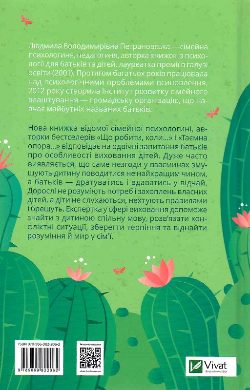 Нова книжка відомої сімейної психологині, авторки бестселерів «Що робити, коли…» і «Таємна опора…» відповідає на одвічні запитання батьків про особливості виховання дітей. Дуже часто виявляється, що саме незгоди у взаєминах змушують дитину поводитися не найкращим чином, а батьків — дратуватись і вдаватись у відчай. Дорослі не розуміють потреб і захоплень власних дітей, а діти не слухаються, нехтують правилами і брешуть. Експертка у сфері виховання допоможе знайти з дитиною спільну мову, розв’язати конфліктні ситуації, зберегти терпіння та віднайти розуміння й мир у сім’ї.