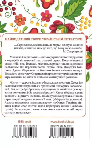 Пропоноване видання містить вибрані твори видатного українського письменника, драматурга Михайла Петровича Старицького (1840–1904), які в повній мірі показують читачеві багатогранність і майстерність автора, вміння писати в абсолютно різних жанрах.