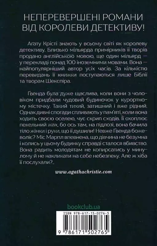 Аґату Крісті знають у всьому світі як королеву детективу. Продано близько мільярда примірників її творів англійською мовою, ще один мільярд — у перекладі 100 іноземними мовами. Вона — найпопулярніший автор усіх часів. За кількістю перевидань її книжки поступаються лише Біблії та творам Шекспіра.