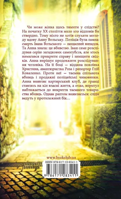 Чи може жінка щось тямити у слідстві? На початку ХХ століття мало хто відповів би ствердно. Тому ніхто не хотів слухати молоду вдову Анну Вольську. Поліція була певна: смерть Івана Вольського — нещасний випадок. Та Анна знала: це вбивство. Іван саме розслідував серію загадкових самогубств, але хтось намагався прикрити справу і знищити свідків. Анна вирішує продовжити розслідування чоловіка. На її боці — віддана покоївка Христина, авантюристка Роза і репортер Гліб Коваленко. Проти неї — таємна спільнота вбивць і продажні поліцейські чиновники. Анна виявляє картярський клуб, де гравці ставлять на кін власні життя, а отже, впритул наближається до викриття таємного товариства убивць. Однак раптом виявляється: сліди ведуть у протилежний бік…