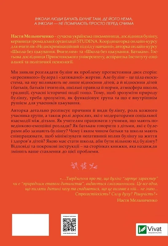 Видання «Зрозуміти (і здолати) булінг» від Анастасії Мельниченко — це докладний аналіз проблеми булінгу, що виходить за межі традиційного розуміння цькування. Авторка розглядає булінг як складну систему взаємодії, в яку входять діти, батьки, вчителі, шкільні правила, атмосфера школи та інші фактори. Книга вчить розуміти механізми булінгу та надає конкретні поради, як з ним боротися.